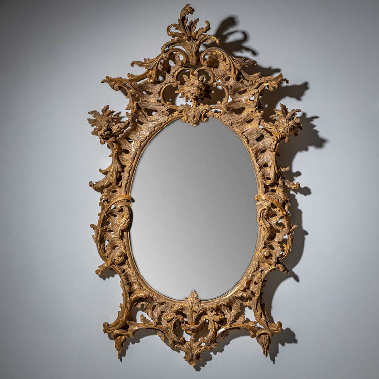 Großer George III Ära Wandspiegel im goldpatinierten Holzrahmen mit C-Spangen, Rocaillen und Rosendekoren und ovalem Spiegelausschnitt.