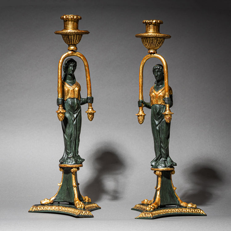 Paar vergoldete und patinierte Empire-Kandelaber aus Holz. Die Kandelaber sind als figürliche Leuchter gestaltet, mit Karyatiden, die als Trägerinnen der Kerzentüllen fungieren. Der Entwurf wird Joseph Danhauser (1780–1829) zugeschrieben und ist ein qualitätvolles Beispiel der Wiener Empirekunst um 1810.
