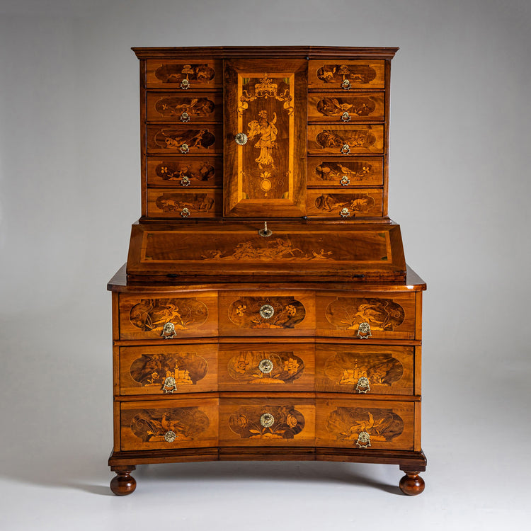 Impressive Baroque secretary in three sections ("à trois corps"), raised on compressed bun feet and veneered in fine walnut. The lower commode section comprises three drawers, with the central one subtly recessed. The panel fronts are richly decorated with intricate marquetry and pyrography, depicting flowers, birds, and monastic landscapes.