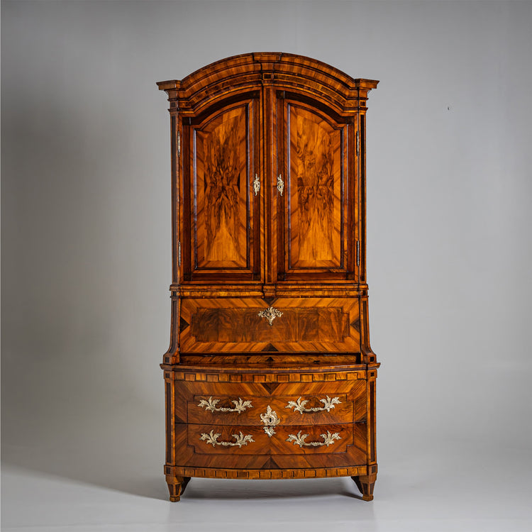 The upper section comprises a two-door cabinet crowned with a molded arched pediment. Inside, the architecture is articulated with pilasters, additional drawers, and a central niche. The piece is veneered in beautifully figured walnut, hand-polished, and fitted with fire-gilt bronze mounts—an outstanding example of mid-18th-century courtly craftsmanship from Dresden.