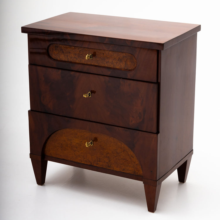 Classic three-drawer Biedermeier chest from Northern Germany, made around 1830. The design is characterized by clean geometry and a striking contrast between the mahogany body and the birch burl veneer accents. The top drawer features a rounded inlay, while the bottom drawer is adorned with an arched motif. Standing on tapered square legs and fitted with elegant brass hardware, the piece has been professionally restored and hand-polished.