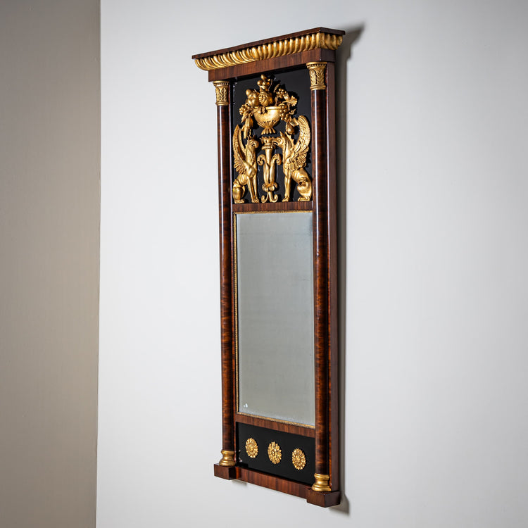 Biedermeier pier mirror veneered in mahogany with ebonized panel insets. Gilded stucco ornaments include rosettes, a fruit basket, and stylized griffins. The mirror is flanked by half-columns with gilt capitals and bases. It is crowned with a broad cornice featuring a gadrooned and gilded frieze. The original mirror plate is bordered by a narrow gilt-patinated stucco molding.