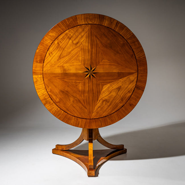 Round table with a cherry-veneered top. The tabletop is decorated with a star-shaped marquetry. The table stands on a trefoil base.