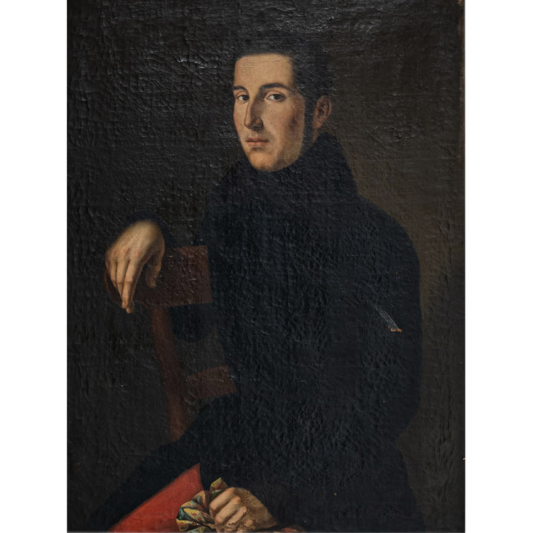 Portrait of a young man from the Biedermeier period, depicted with dark hair and dark attire. Oil on canvas. The surface exhibits age-related craquelure and minor areas of damage. Presented in a gilt Empire-style stucco frame. Unsigned.