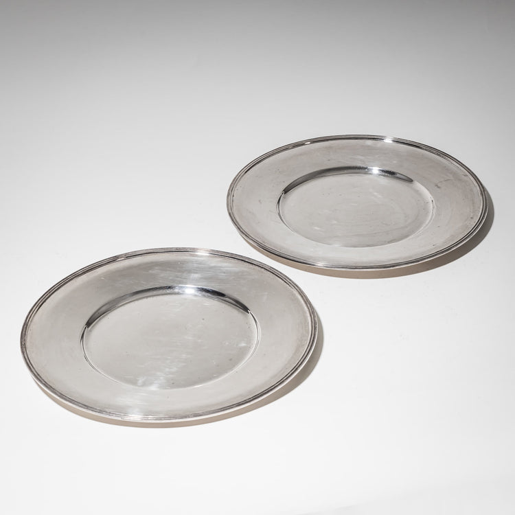 Pair of minimalist silver charger plates featuring a smooth well and plain rim. The subtly profiled edge adds a touch of understated elegance. Stamped: Wilkens. Total weight: 1,009 g