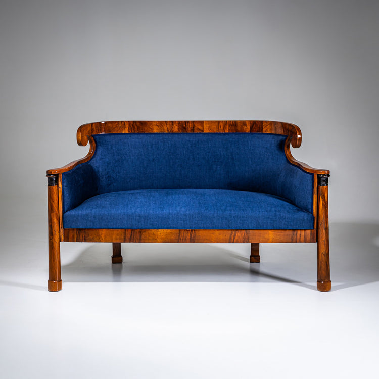 Biedermeier two-seater sofa veneered in walnut, standing on column legs with ebonized capitals. The gently curved backrest terminates in stylized volutes. The sofa has been newly upholstered in dark blue fabric and hand-polished.