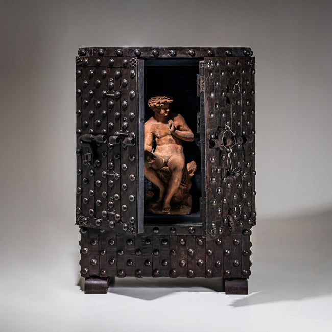 Large iron cassaforte with riveted fittings and double doors. The safe is equipped with a sophisticated locking and opening mechanism.