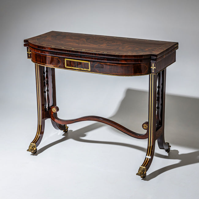 English mahogany console table on wheels with lion heads and brass inlays, turned rods between the legs and a curved intermediate strut. The tabletop is slightly curved at the long sides and covered with green felt on the inside. There is storage space underneath. The console has been hand-polished. Size opened: 71 x 88 x 86 cm.