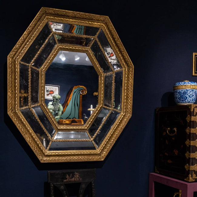 Large wall mirror with gold patinated octagonal wooden frame and old mirror glass blinded in places.