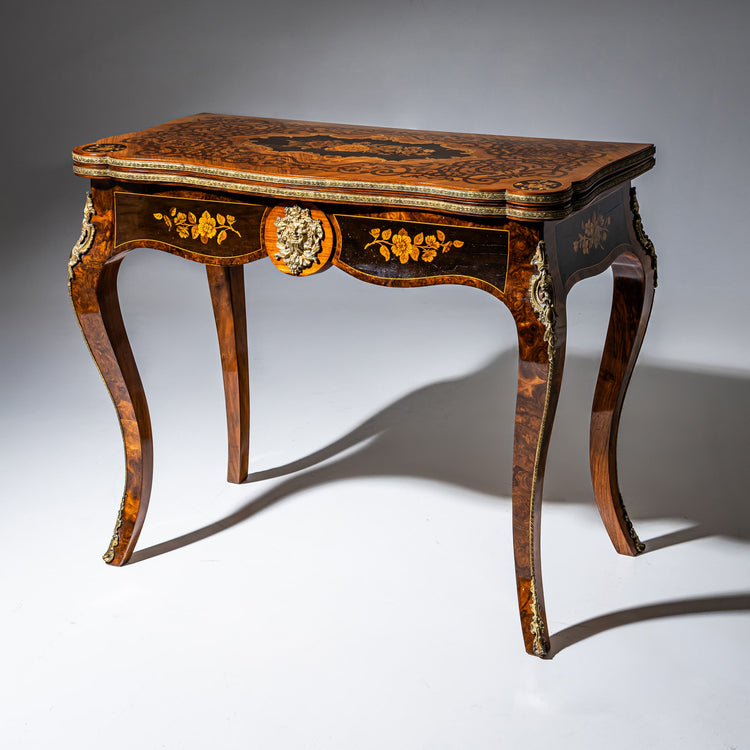 Elegant games table standing on cabriole legs, veneered in burl wood and fitted with bronze mounts in the form of rocaille and satyr masks. The edges of the folding top are accentuated with a decorative band. The serpentine apron is decorated with floral marquetry, while the top is richly inlaid with strapwork and a central medallion featuring a floral bouquet. The top rotates by 90 degrees and opens, revealing a blue felt-lined interior. Dimensions (open): 36.2 × 35.4 in The table has been professionally restored and hand polished.