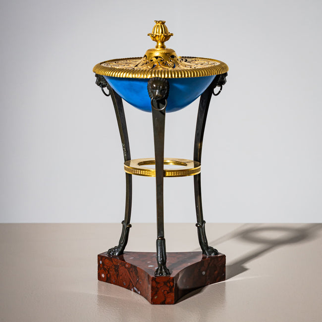 Small perfume burner with pierced lid and finial. Beneath rests a pale blue glass bowl supported by three legs with lion-head protomes, joined by a gilt ring. The legs terminate in lion’s paw feet on a trefoil red marble base.