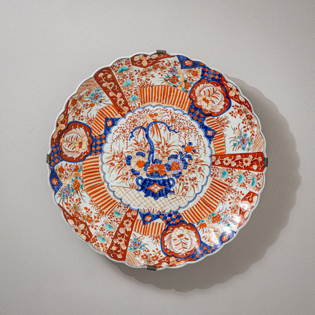 Large Japanese Imari wall plate with a diameter of Ø48 cm, a scalloped rim and finely painted decoration. The central medallion features a floral bouquet with cherry blossoms and small birds.