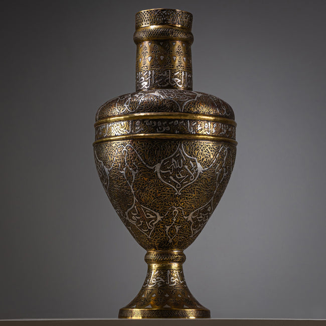 Tall brass vase featuring a cylindrical neck, rounded body, and a slightly flaring foot. The surface is finely chased and inlaid with silver, while the neck displays intricate openwork (ajour) decoration. An Arabic inscription encircles the body, framed by delicate profiled borders. A refined example of Islamic metalwork craftsmanship.
