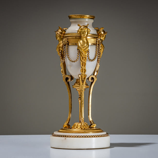 Small and refined Louis XVI cassolette crafted from marble and fire-gilded bronze. It stands on a circular base with a delicate beaded rim and a tripod support formed by helmeted Hermes figures, each adorned with an Aesculapian staff. Connected by fine beaded chains, they encircle the oval body in a classically inspired arrangement. The upper insert is removable and rotatable, featuring a decorative knop on one side and a candle nozzle for taper candles on the other.