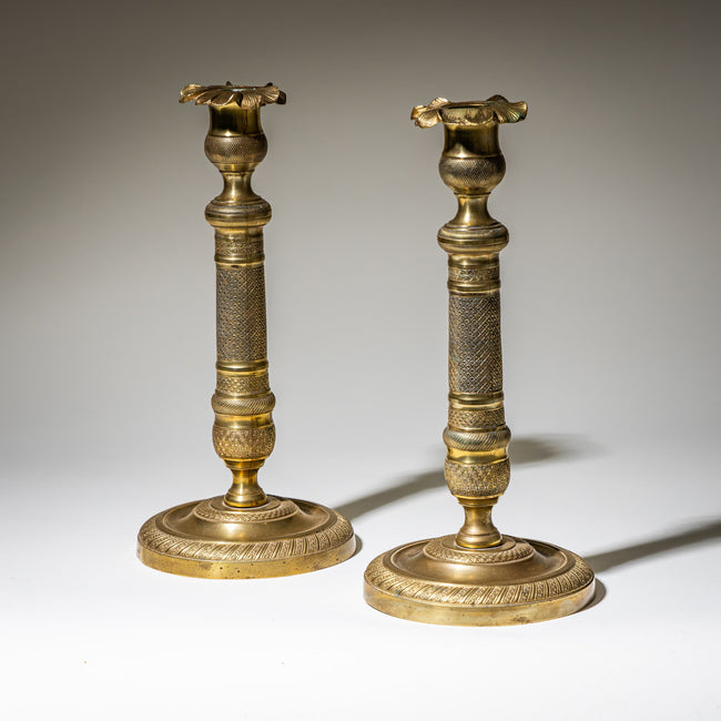 Pair of brass candlesticks on a round base with cord frieze, cylindrical stem with an all-around checkered pattern, and socket shaped as stylized leaves.