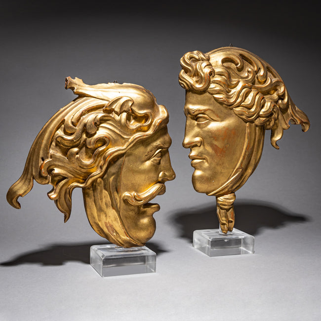 Pair of decorative giltwood reliefs, depicting two stylized masks with flowing hair and expressive features. One face represents a bearded man with a curled moustache, the other a younger, idealized male figure in the classical manner. Mounted on acrylic stands.