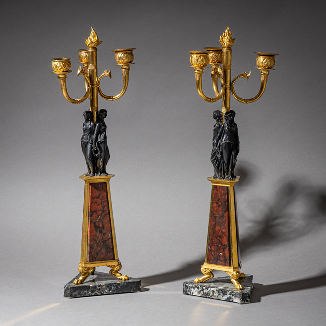 Pair of Italian girandoles on triangular marble bases with pyramidal Rouge Griotte marble plinths, resting on gilded bronze paw feet. Each features three black-patinated caryatids supporting a central stem with three candle branches, topped with flame-shaped finials.