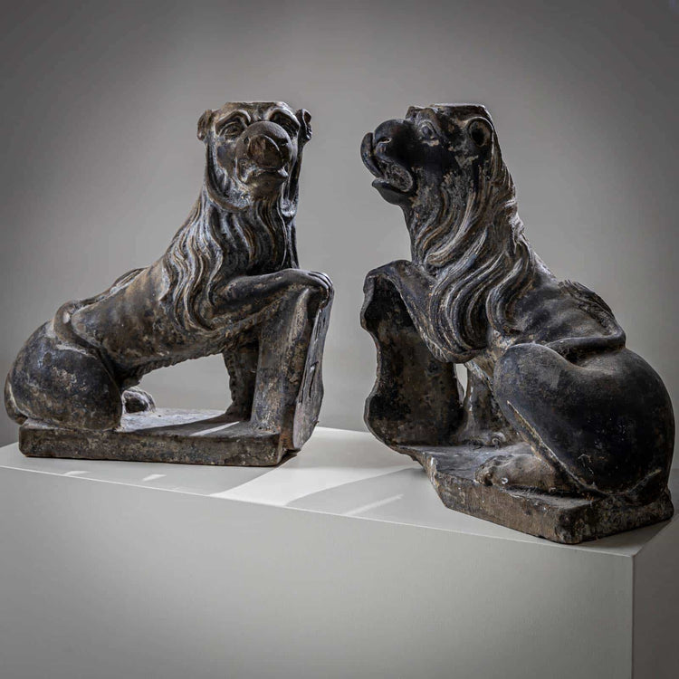 A pair of lions of the same design made of stone with escutcheons. Together they bear the date 1701 and the monogram B. W.
