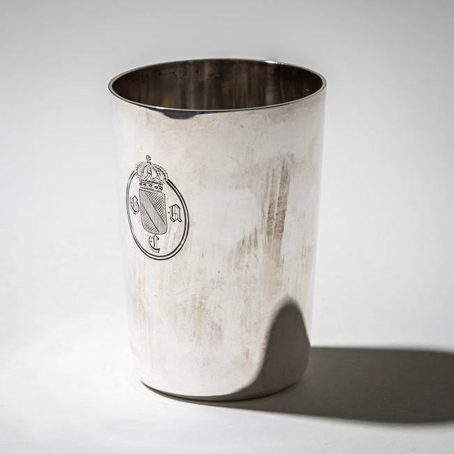 Slightly tapered silver beaker with a smooth wall, adorned with the embossed coat of arms of the Grand Dukes of Baden. Hallmarked on the base with crescent moon and crown, Silber 800, and the maker’s mark of Wilhelm Binder, Schwäbisch Gmünd. Weight: 97 g