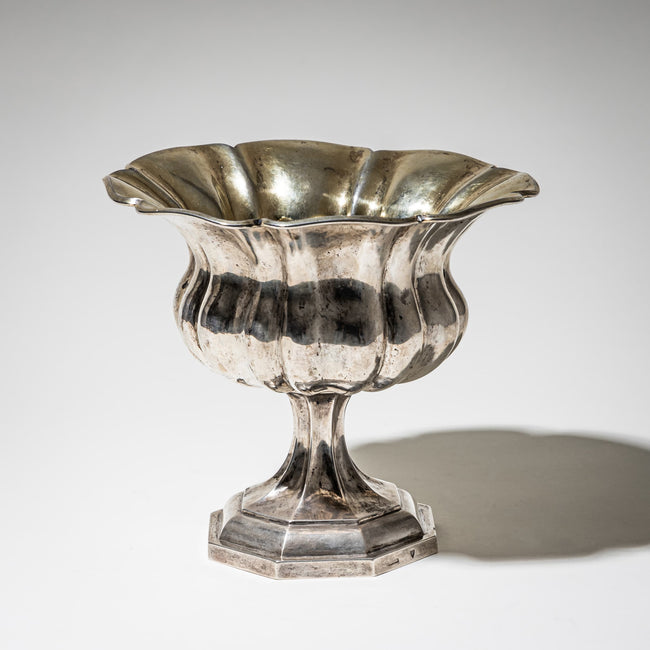 Elegant pedestal bowl in tulip form, featuring a gadrooned body and an octagonal base. A fine example of 19th-century South German silverwork. Hallmarked at the base with Munich city mark, the date mark for 1843, and the maker’s mark of Joseph II. Westermayer. Weight: 511 g
