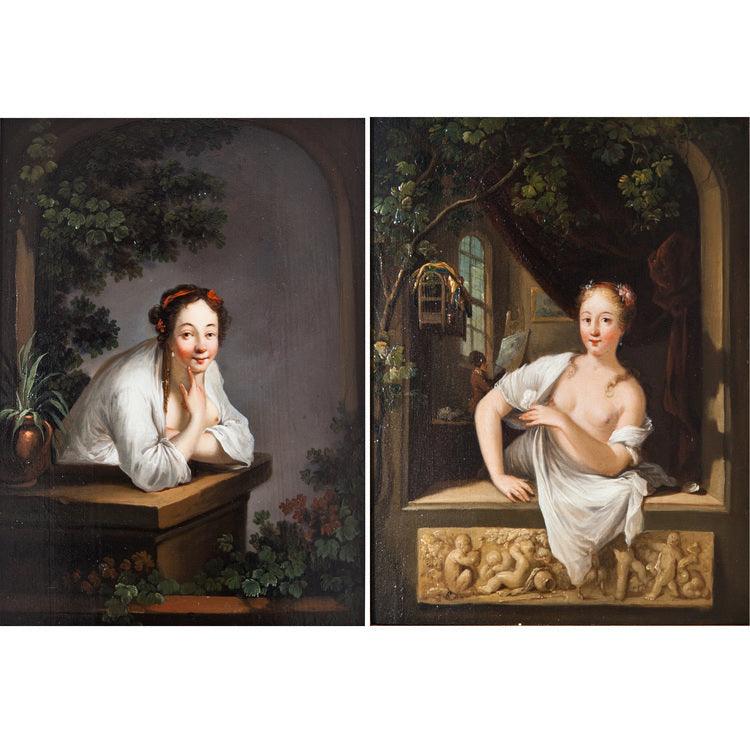 Pendant window pictures attributed to Christian Wilhelm Ernst Dietrich, called Dietricy (1712 Weimar - 1774 Dresden). Typical genre depiction of two pretty young ladies leaning out of arched windows. Both ladies are shown open-hearted with white blouses. One painting shows a lady with a red hair band and red cheeks leaning on a low railing and looking at the observer with a slightly glassy gaze. The window opening is framed with vine tendrils and a Mediterranean potted plant on the left edge of the painting. The other painting shows a young beauty with flowers in her hair, leaning loosely out of a window opening with a relief depiction of putti and the same green vine leaves. A red velvet curtain is pulled aside, revealing in the background the painter at his easel in front of another round-arched window with barred glass panes, which has illuminated the view into the painter's studio. Dietricy used this originally Dutch motif in a series of works. The fine painting could be shown to its best advantage especially in the smaller format. The direct gaze of the bared ladies together with certain attributes, the cloth, loosely draped over the balustrade, shell and birdcage and the relief with putti as bacchants, suggest eroticism and (venal) love. An extremely similar work with an insight into the painter's studio was executed for Duke Christian Ludwig II of Mecklenburg-Schwerin. Oil on wood, unsigned. Framed in a gold patinated frame with a groove. Picture dimensions: 32 x 23 and 32 x 23 cm. Provenance: privately owned since the 1970s Lit: Petra Schniewind Michel: Christian Wilhelm Ernst Dietrich (1712-1774) genannt Dietricy, Munich 2012, p.198 and p. 199, Fig. 155.