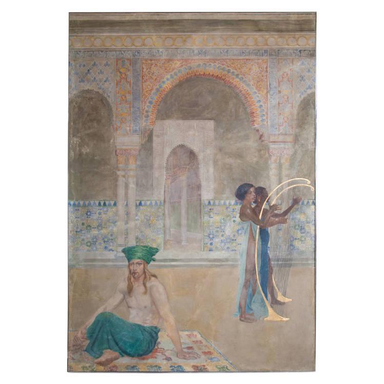 Very large high rectangular fresco depicting a man seated in the foreground wearing a green turban and two harp-playing women in the middle ground against an oriental architectural backdrop. The fresco has been professionally restored, reinforced on the back and framed. This fresco was part of a cycle of paintings executed by Josef Engelhart (Vienna 1864-1941) for the dining room of the Gottlieb Taussig Palace (Schönbrunner Strasse 215) in Vienna. Christof Martin Wieland's verse epic "Oberon" from 1780 served as a model. The palace was hit by a bomb in 1945, as a result of which the frescoes were removed. Six frescoes are available. Provenance: Hofstätter Collection Vienna