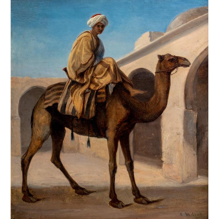 Depiction of a Bedouin on a camel in front of an architectural backdrop. Karl-Wilhelm Gentz (Neuruppin 1822- Berlin 1890) travelled through Asia Minor, Egypt and Morocco on his study trips, which made him one of the most famous Oriental painters of his time. Oil on cardboard. Signed lower right, inscribed on the reverse.