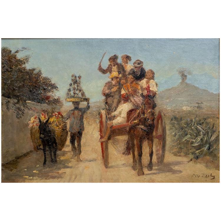 Otto Bache (1839-1927) Italian attendance, 19th Century. Oil on canvas. Signed lower right. The Danish artist Otto Bache was already ten years old student of the Academy of Arts in Copenhagen and a student of Wilhelm Marstrand (1810-1873), later a member of the Royal Academy of Arts and from 1887 professor of the same. Otto Baches' artworks are part of important collections such as the Danish, Swedish, or Scottish National Gallery. As a favorite portrait painter of the Danish court and aristocracy, his Œuvre is mainly distinguished in a popular genre and animal paintings. The fresh temperament of his painting style in the confident composition is also evident in this Italian team. An Italian company, almost piling on the fully loaded wagon, while a fellow traveler drives the load carrier and donkey next to the team, blends into the landscape. In the background, the volcano smokes while the driving team stirs up the dry ground in the barren landscape with dust. Frame: 38,5 x 51,5 cm
