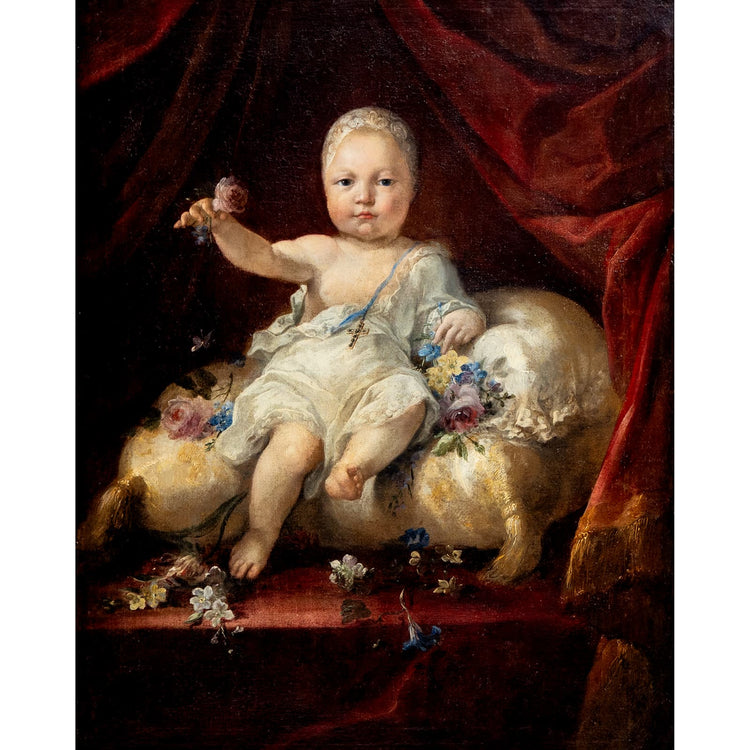 Large-format depiction of an aristocratic child in a white christening gown with a large, gem-set cross on a blue ribbon on his stomach. The child rests on a thick cushion with tassels and is bedded on colorful flowers. The background consists of a rich red velvet curtain with a golden fringed border.