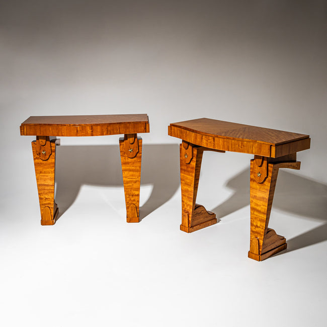 Pair satinwood consoles with brass star appliques and a wavy front. The consoles shows a very beautiful wood grain. They were redesigned under use of old parts.