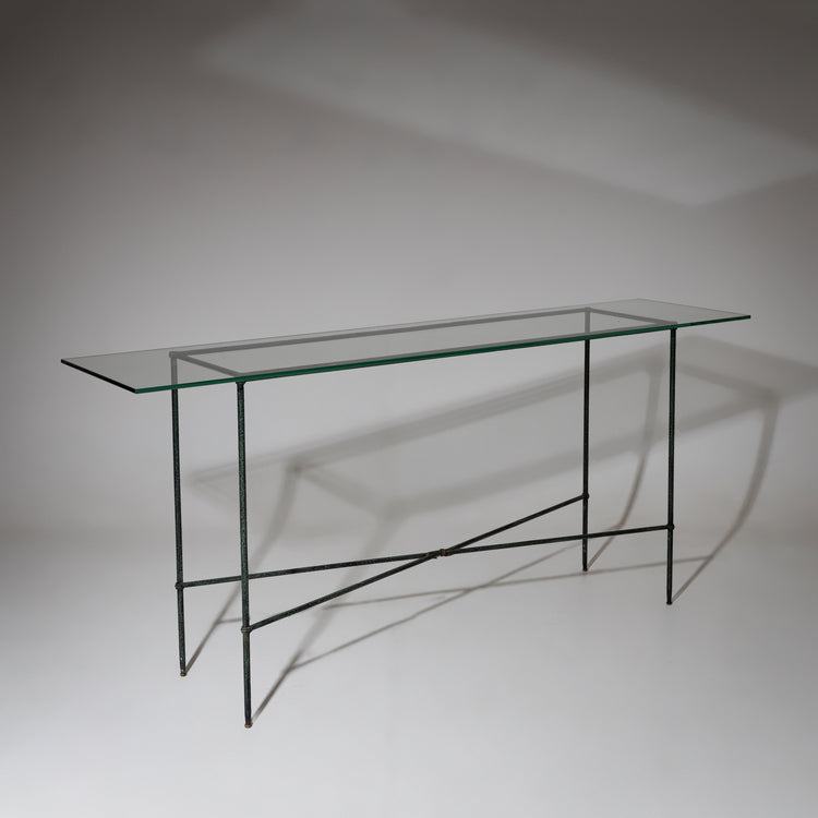 Narrow console table with a rectangular glass top and a green-patinated iron frame. The X-shaped crossbar provides stability and enhances the sleek, understated design.