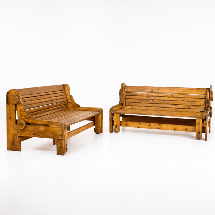 Pair of benches with extendable recliners made of beech wood. Very nice natural patina.
