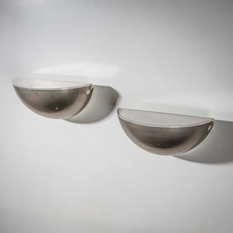 This pair of wall lights in the form of a quarter sphere was designed by Tobia Scarpa for FLOS. They are made of aluminium and ribbed glass. Each is stamped on the reverse.