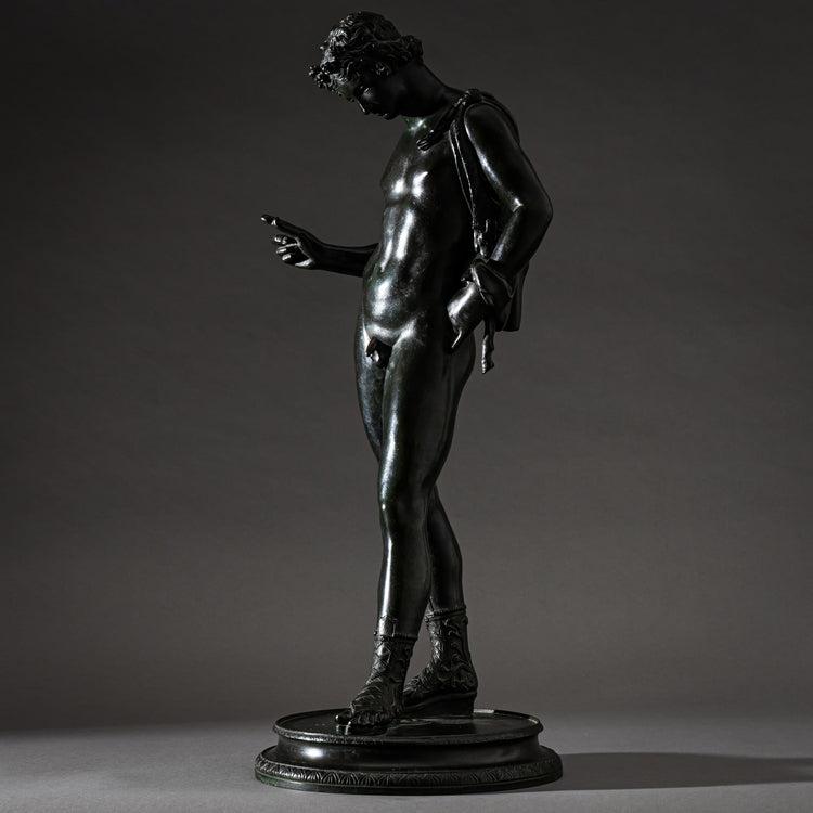 Large bronze figure of Narcissus, after an ancient model. The nude youth is depicted in a classical pose and stands on a circular plinth with anthemion friezes.