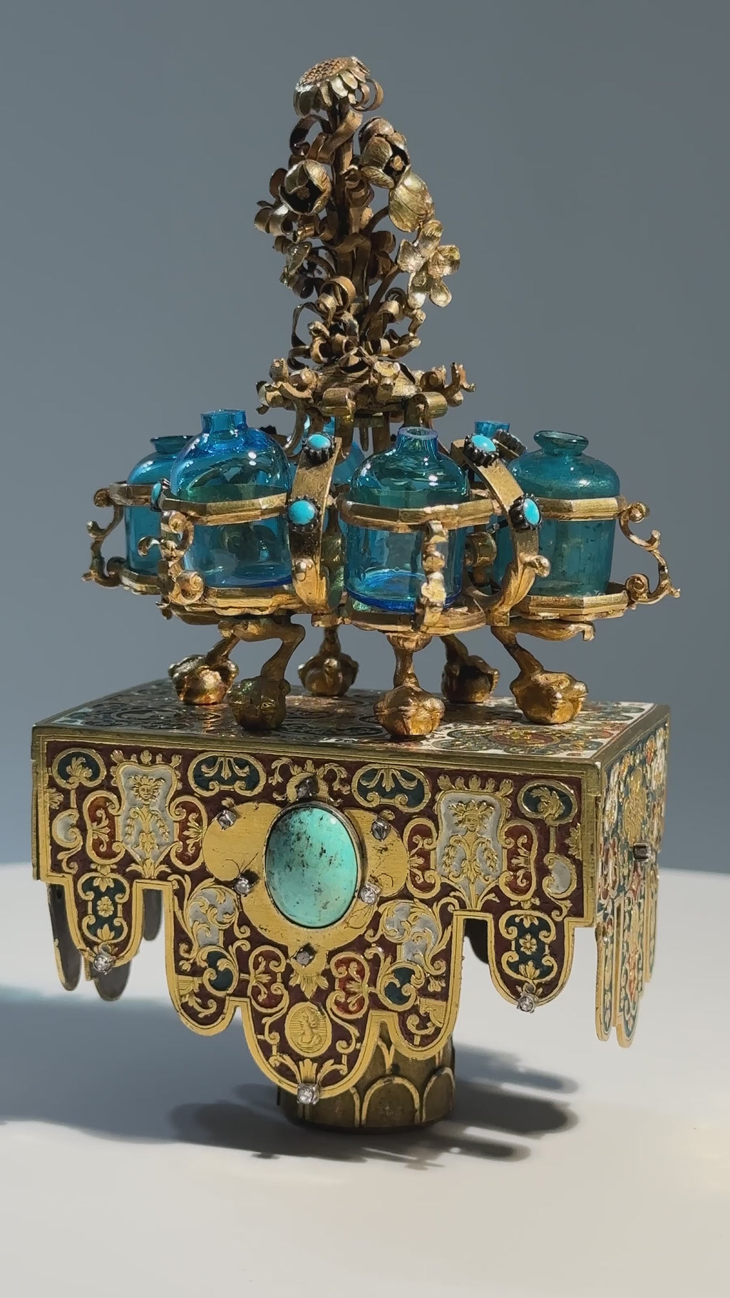 Finely crafted goldsmith’s work in the form of an oriental sedan chair richly decorated with enamel. The piece features a small superstructure fitted with blue glass perfume flasks. The sides are set with turquoise cabochons, with additional smaller turquoise stones applied to the frame. Four of the glass flasks are later replacements. The sedan chair was originally supported by sculptural bearer figures, now missing. The work was likely created in the circle or workshop tradition of Johann Melchior Dinglinger (1664–1731), court jeweler to Augustus the Strong in Dresden. A comparable object is held in the Hermitage Museum in St. Petersburg, catalogued as a German work of the 17th century. Illustrated in: Art Treasures of Russia, St. Petersburg, 1902.