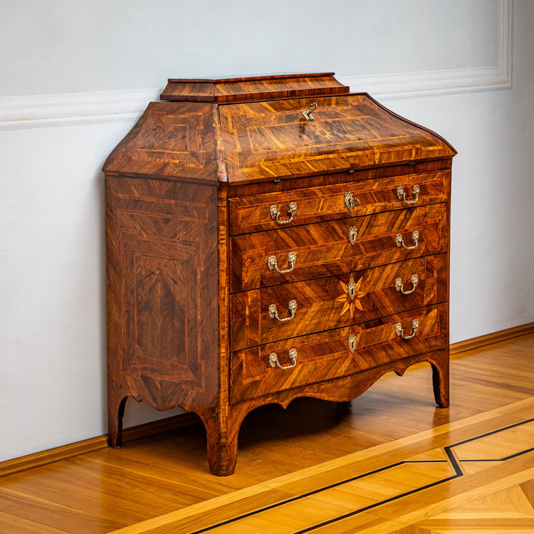Italian secretaire standing on bracket feet with four drawers and trapezoidal top with an inclined flap. The walnut veneer is contrasted with panel-shaped frames and decorated with a large star-shaped inlay on the front. Behind the writing flap there are four more small drawers. The secretaire has been expertly restored and hand polished, while preserving the old patina.
