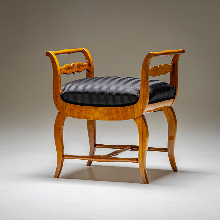 Biedermeier tabouret in cherrywood with H-shaped stretcher connecting the curved legs. The armrests are joined by a crossbar adorned with stylized leaf motifs. The seat has been newly upholstered and covered with a black striped fabric.