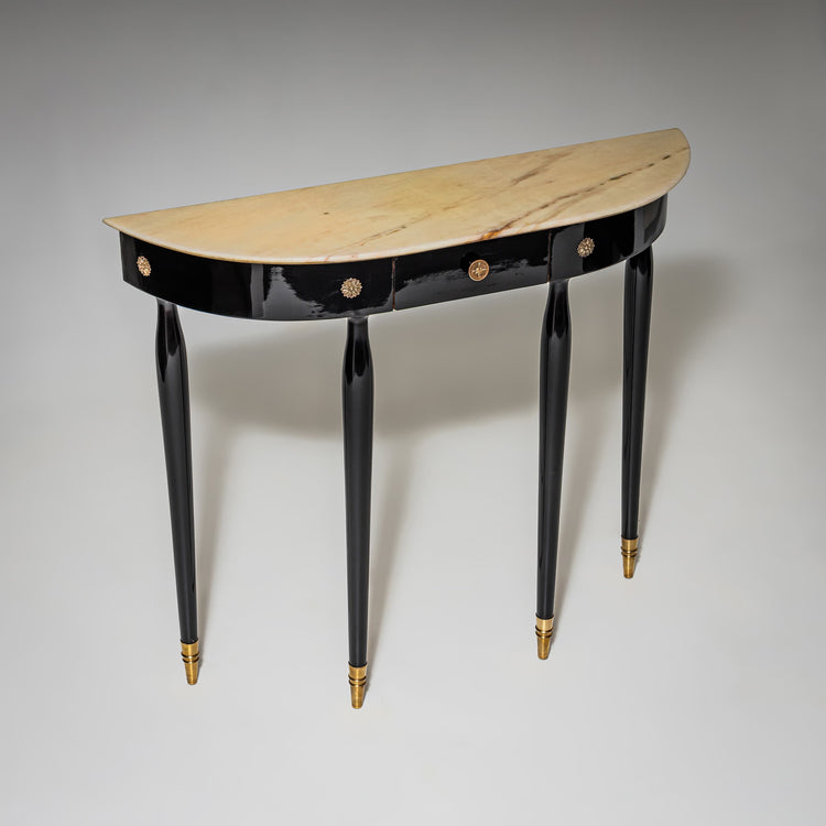 Ebonized demi-lune console table with four tapered legs, brass sabots, and rosette mounts on the apron. A drawer is integrated into the apron. The tabletop features a beige onyx slab. Restored and hand-polished.
