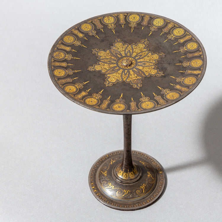 Delicate small Spanish tazza with Moorish-inspired gold-inlaid decoration to the bowl interior and circular disc foot. Finely executed historicist metalwork in the tradition of late 19th-century Toledan damascening. Plácido Zuloaga was the leading figure in the revival of Spanish damascening in the 19th century. Trained in the Zuloaga family workshop, he elevated the craft of gold inlay on iron to international prominence. His works were widely exhibited in Europe and the United States and are today held in major museum collections.