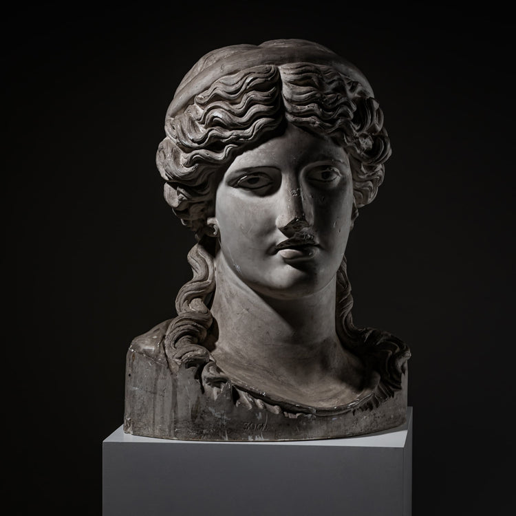 Over life-size academic plaster bust modeled after a Roman antique prototype, depicting a female figure with curly hair and a headband. The sculpture shows age-related chips to the nose and mouth.