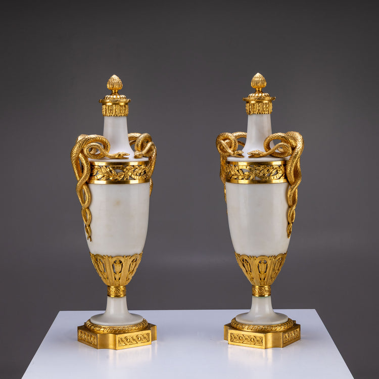Pair of Napoleon III–style cassolettes crafted from white marble with richly detailed gilt-bronze mounts. The handles are formed by two symmetrically intertwined snakes with open jaws, rendered in a naturalistic and finely sculpted manner. The classical Louis XVI-style vase bodies rest on a gilt four-lobed base with a twisted profile and a tapered foot adorned with banded decoration and stylized leaf calyxes. The artichoke-shaped finials are removable, revealing sockets for taper candles. Incised signature “A + D” (unidentified). Professionally cleaned and polished.