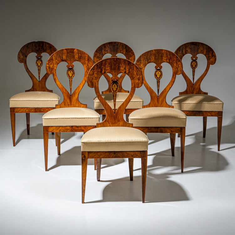 Set of six Biedermeier chairs featuring balloon-shaped backrests with heart-shaped cut-outs and a marquetry splat decorated with leaf motifs and subtle shading. Fine string inlays elegantly frame the backrests. Veneered in walnut, the chairs stand on slender tapered square legs. The seats are upholstered in an elegant gold-toned fabric, and the frames have been hand polished.