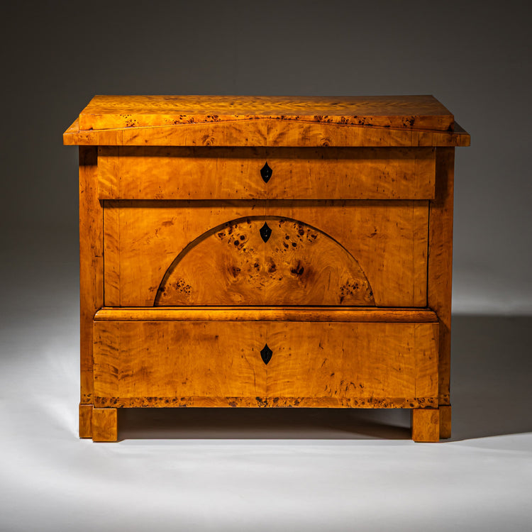 Three-drawer Biedermeier chest veneered in birch with burl veneer accents and ebonized escutcheons.