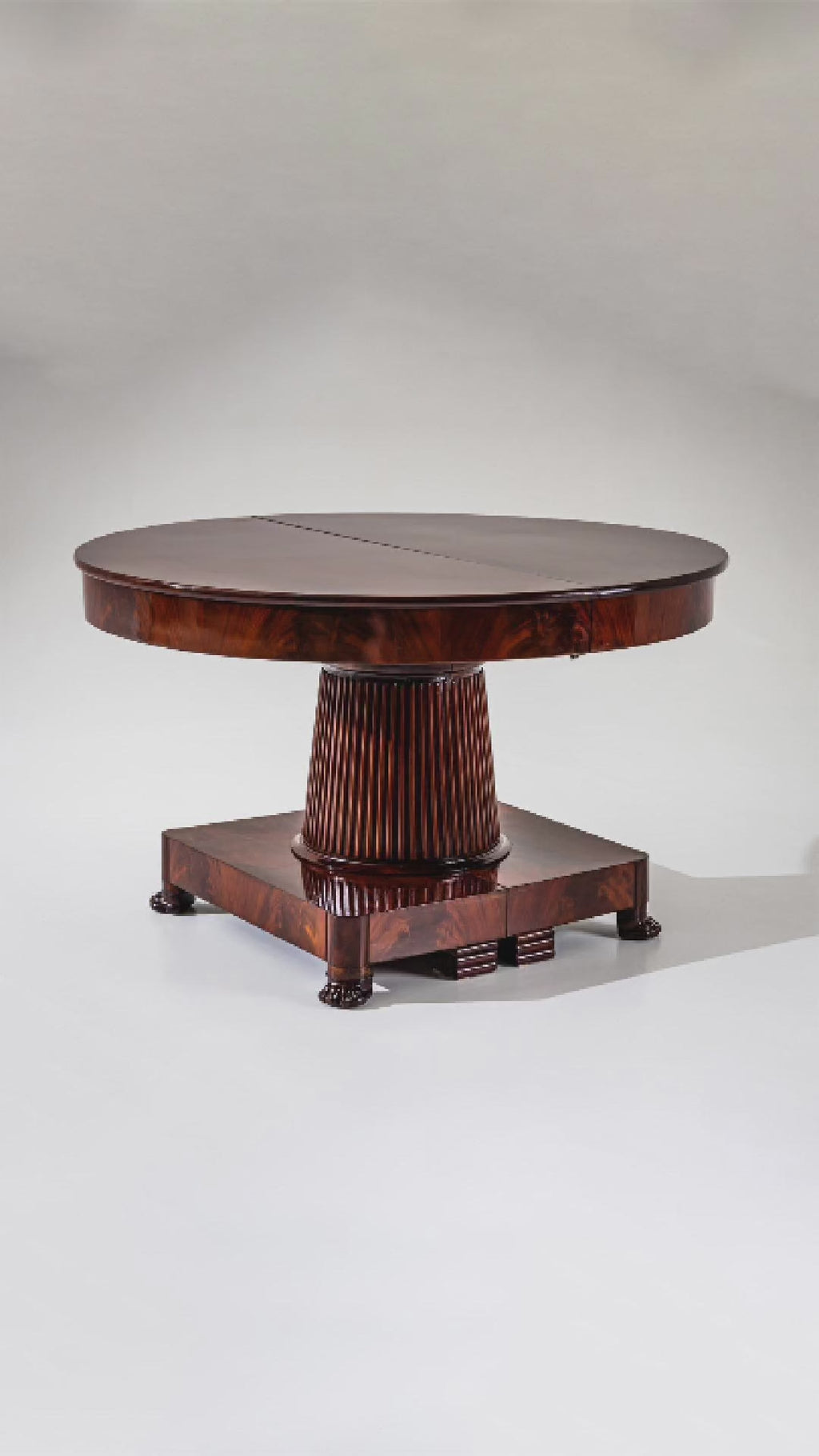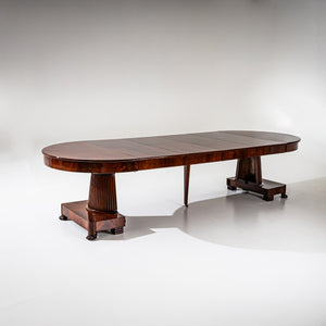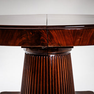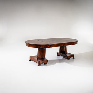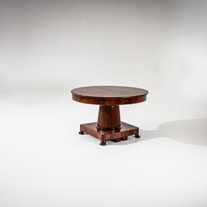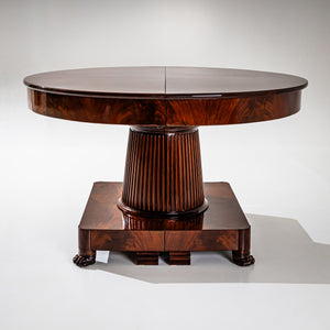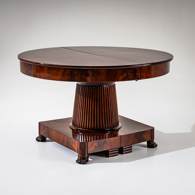 Elegant neoclassical extending table with a round mahogany top supported by a fluted, robust pedestal column. The base rests on a square platform with carved paw feet and profiled stabilizing plinths. The table can be extended in stages up to a total length of 377 cm (approx. 148.4 in). It includes five individual leaves, each measuring 49.5 cm (approx. 19.5 in) in width. Expertly restored and hand-polished.
