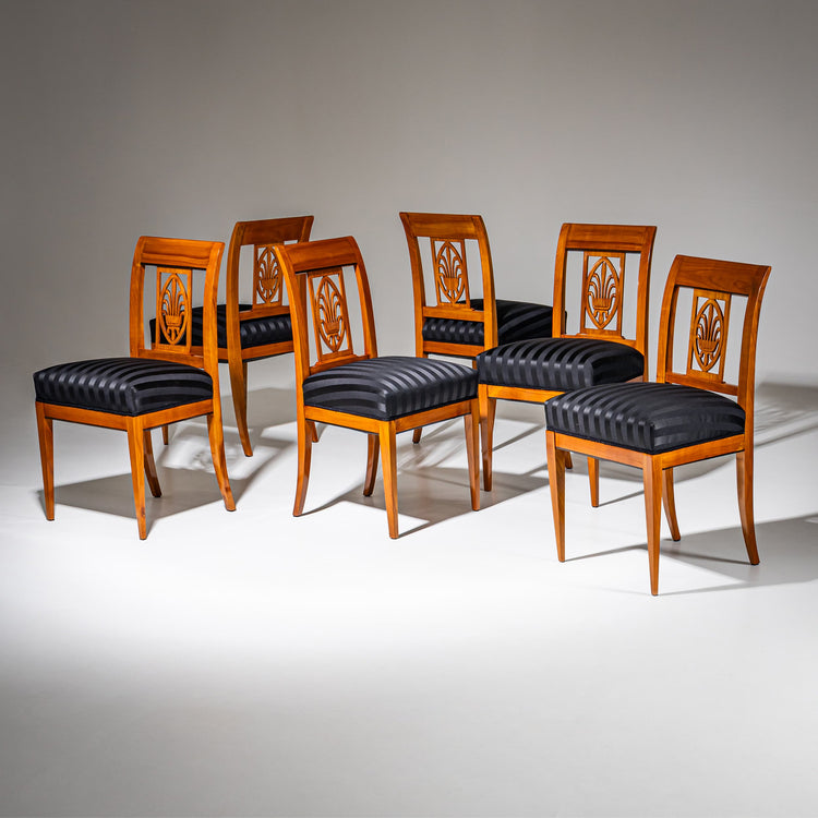 Set of six dining chairs in cherrywood with upholstered seats, raised on tapered square legs with straight aprons. The seats have been newly upholstered in a black striped fabric. The openwork backrests feature a fern motif within an oval frame.
