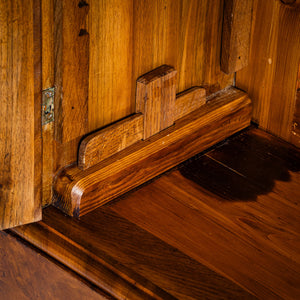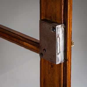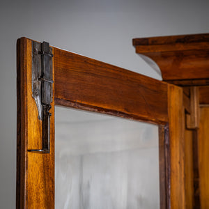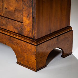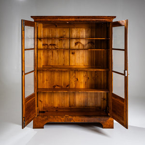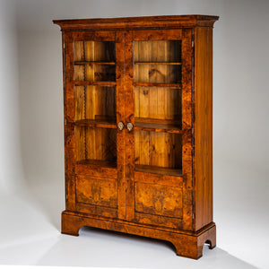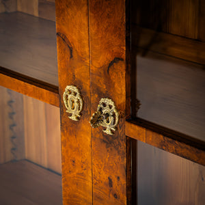 Biedermeier-Bücherschrank mit zweitüriger Front und dreiviertel Verglasung. Das Möbel ruht auf einem ausgeschnittenen Zargenfuß und ist mit fein gemaserter Nussbaum-Wurzel furniert. Die Schlüsselschilder bestehen aus feuervergoldeter Bronze. Im Inneren befinden sich vier in der Höhe verstellbare Einlegeböden. Der Schrank wurde fachgerecht restauriert und von Hand poliert.