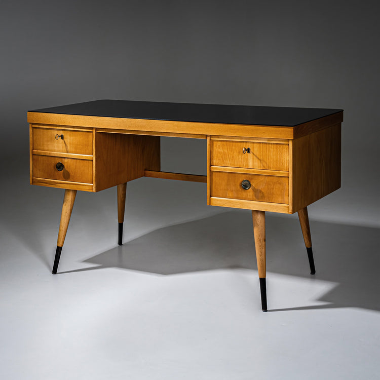 Niedriger Schreibtisch aus hellem Buchenholz auf konischen Beinen mit schwarzen, gerillten Füßen. Das Möbel verfügt über vier Schubladen, von denen zwei abschließbar sind, und bietet großzügigen Stauraum.