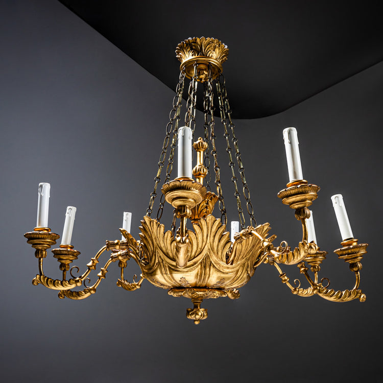 Achtflammiger blattvergoldeter Deckenluster aus Holz sowie kleineren Zinngusselementen in Ölvergoldung. Der Kronleuchter wurde elektrifiziert.