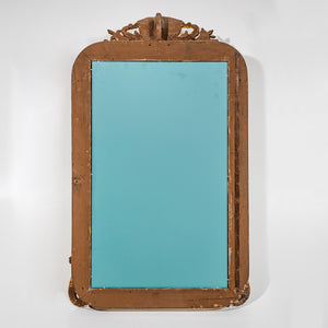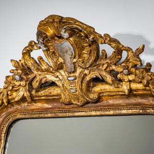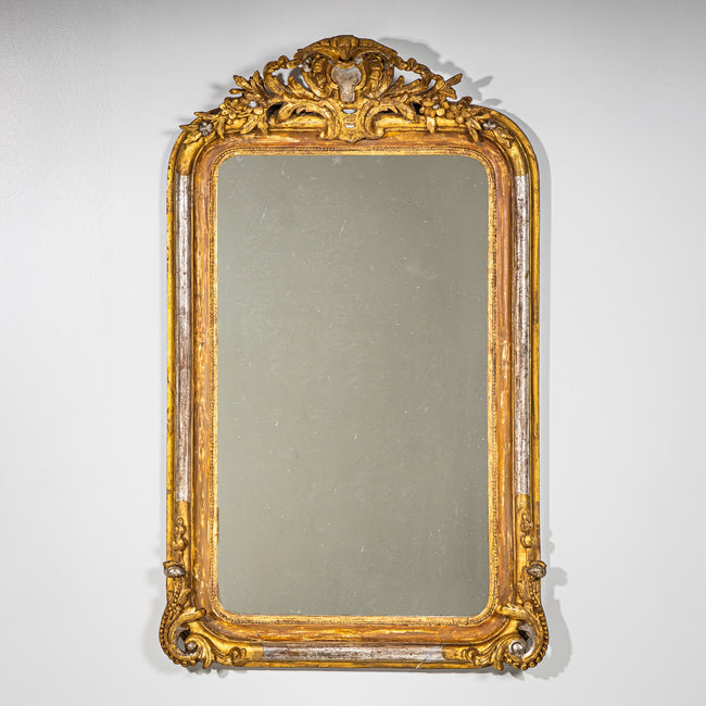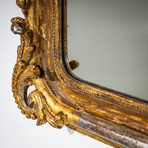 Wandspiegel mit abgerundeten Ecken und profilierter Leiste, verziert mit einem feinen Perlstabdekor. Die unteren Ecken schmücken aufwendig gearbeitete Stuckapplikationen in Form von Rocaillen. Den oberen Abschluss bildet ein dekorativer Aufsatz mit floralen Elementen und einer zentralen Muschelkartusche. Die vergoldete und versilberte Patinierung zeigt Altersspuren. Das Spiegelglas wurde erneuert.