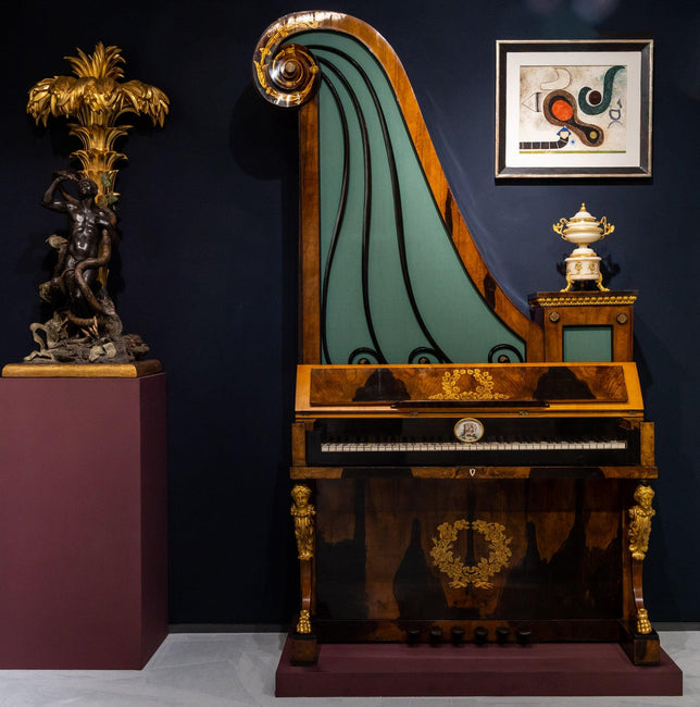In Nussbaum auf Fichte furniert mit vergoldeten Elementen, schwarzer Maserierungs- und Goldornamentmalerei sowie Elfenbeintasten. Auf Porzellanplakette bezeichnet. Die Klaviatur umfasst sechs Oktaven mit sechs Pedalen. EU-Bescheinigung 224 vorliegend.